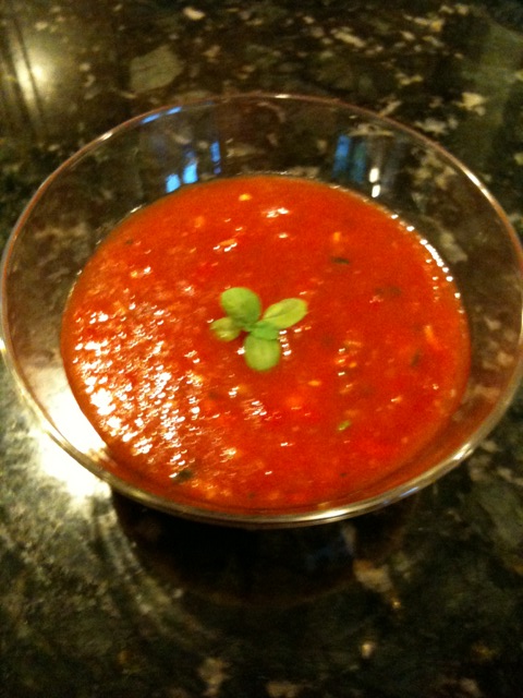 I’ve had a craving for this cold, spicy soup for days…I’ve been on vacation, had tons of fun on the Carnival Destiny…but did they have what I craved on that floating never-ending array of food? Nope. I had to come home and make some myself. I have a nice container to add to the cooler for our 7 hr drive to Savannah, GA tomorrow. Hopefully my husband won’t mind the garlic breath! Here’s the recipe:
