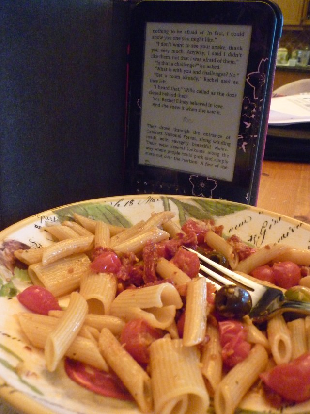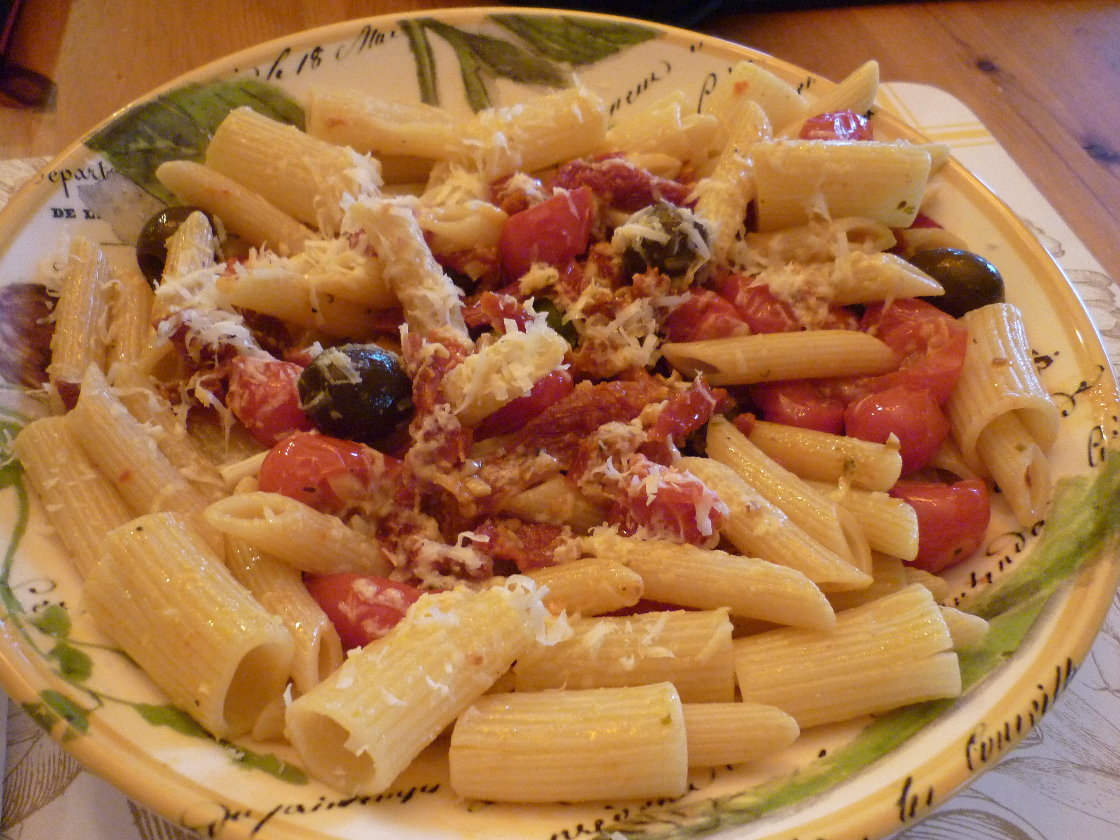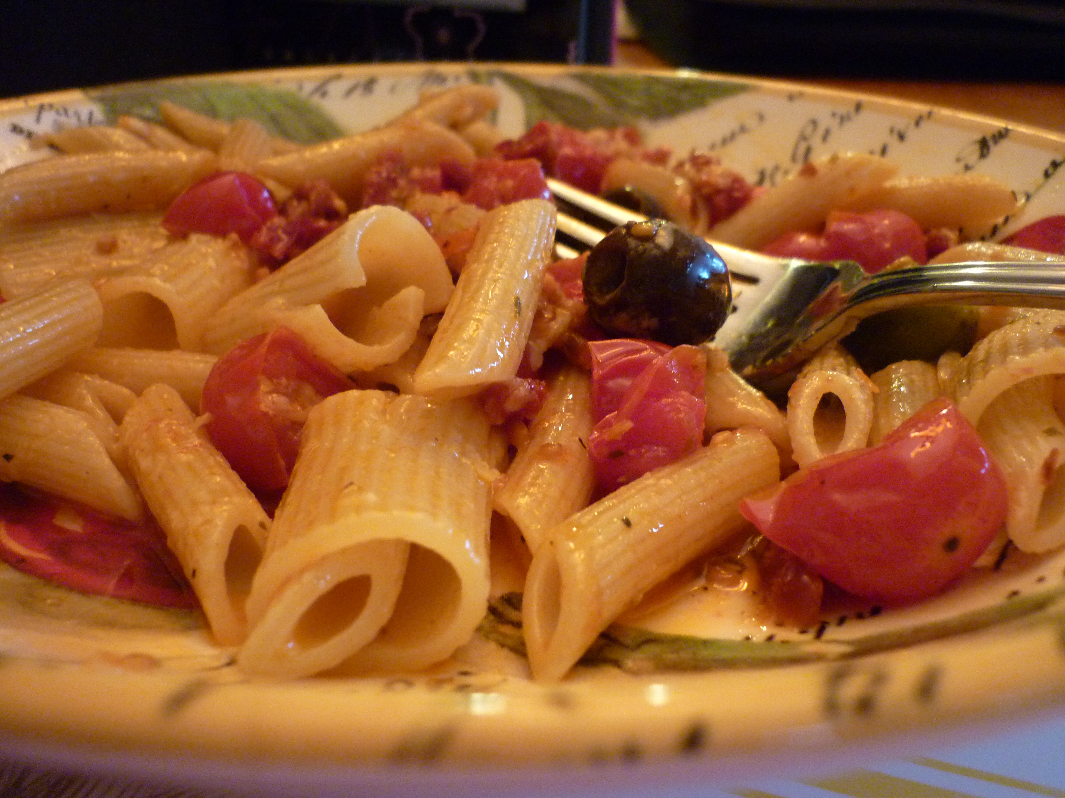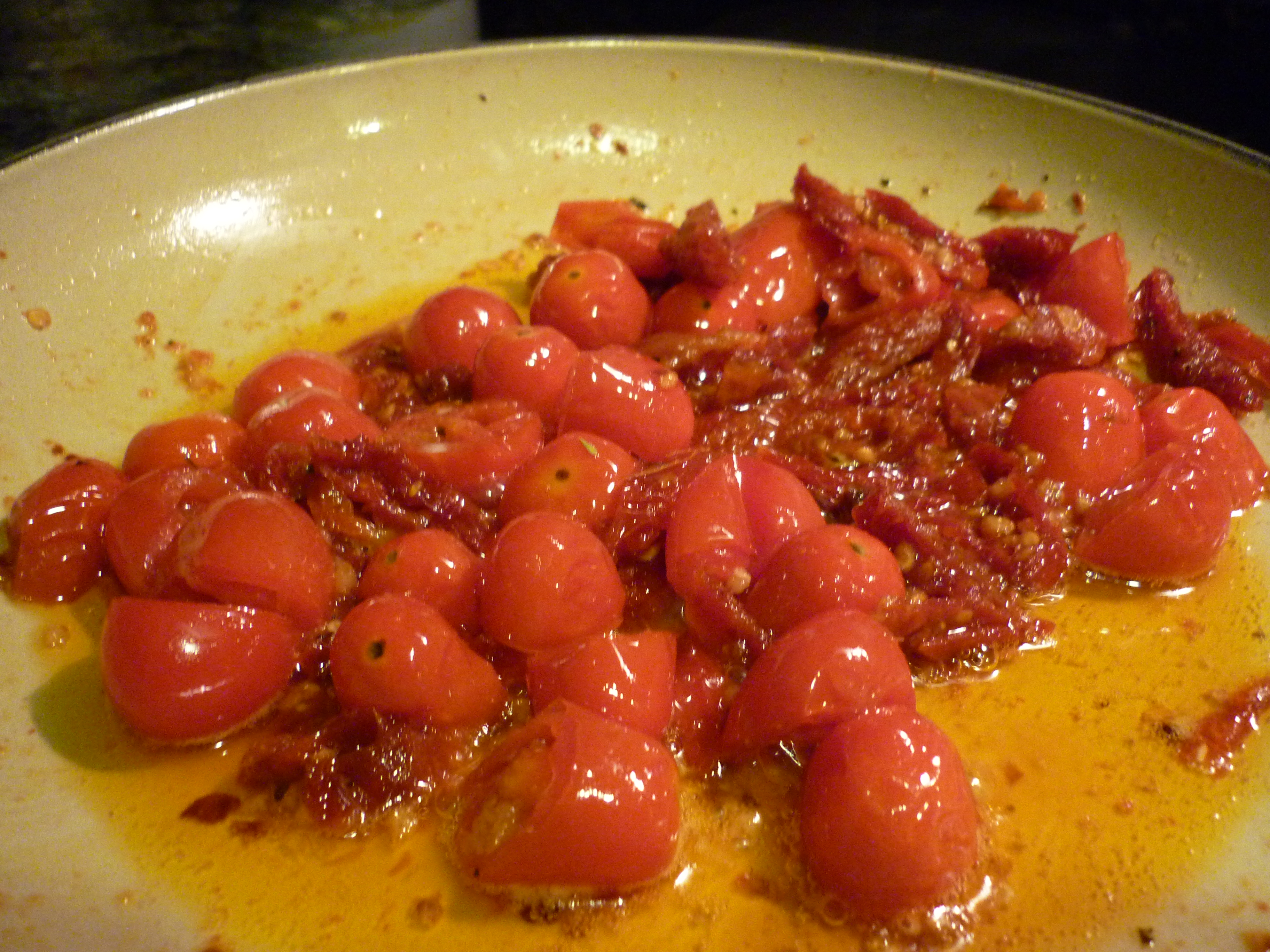 Mark’s working late, Lacey’s working late. I find myself alone for dinner…which is not really such a bad thing once in a while. I’m hungry, but what to eat? I’m feeling like some pasta and I have a few delicious things on hand. I get my trusty little sauté pan, twice around with the Olive oil, add some halved cherry tomatoes, some sun-dried tomatoes, red pepper flakes and a clove or 2 of crushed garlic and I have the makings of a wonderful supper. I don’t have to worry about anyone else’s taste-just mine.