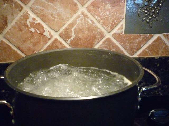 OK, my pasta is almost done, so I add a final sprinkle of minced garlic and I’m ready to dump my pasta into the saute pan.