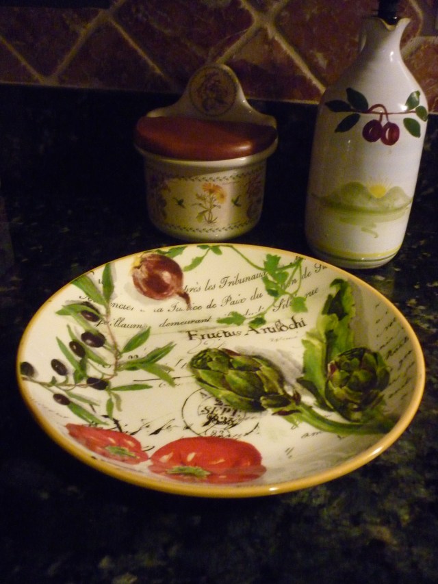 I have some nice organic pasta to throw in. Meanwhile, I still want to add a bit more to the saute to give it more depth. I find some olives that I marinated in olive oil, a bit of lemon juice, a crushed garlic clove and some Italian seasoning. These marinated olives are from Laura Calder‘s book, French Food at Home. I spoon out 5 or 6 olives and some of the marinade and put it in my pretty little pasta bowl.