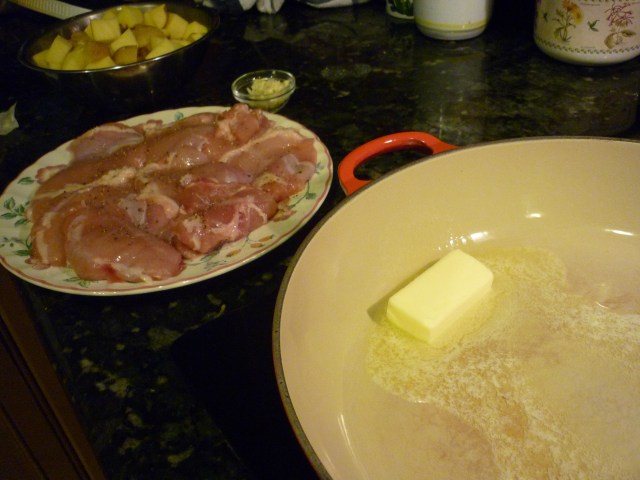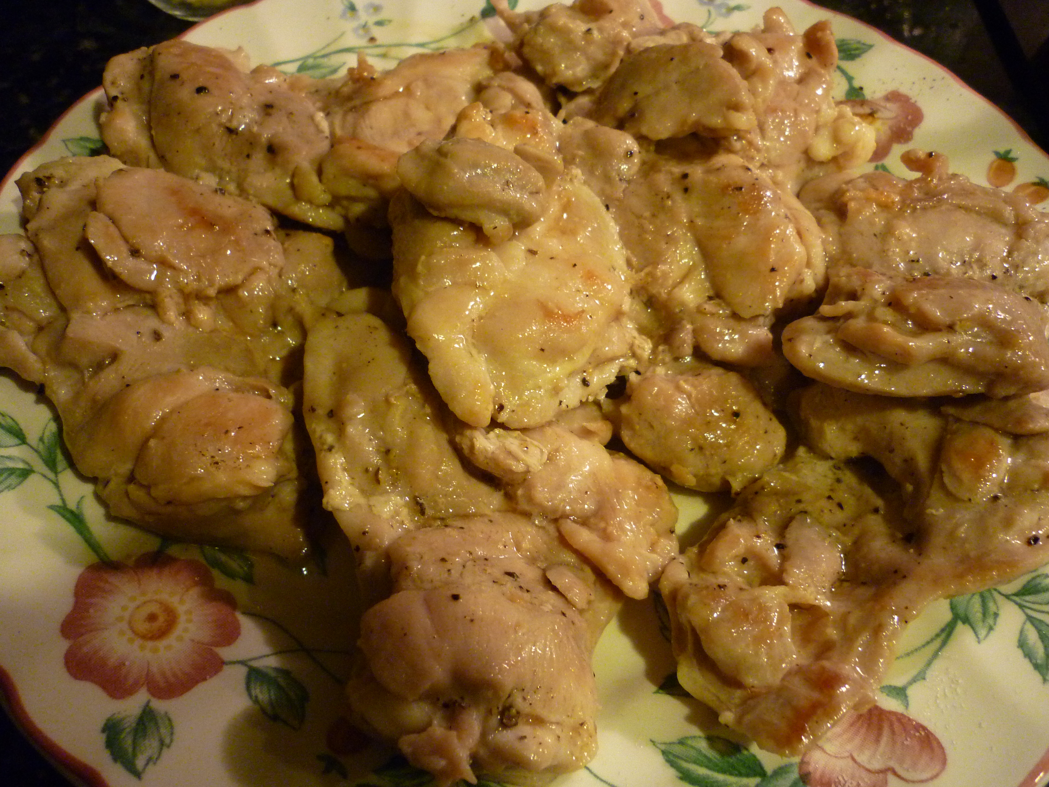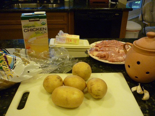 2lbs of deboned free range chicken thighs, potatoes, butter, garlic, chicken broth, parsley & white wine.