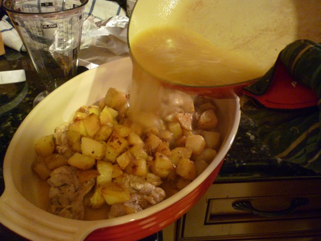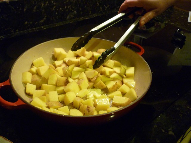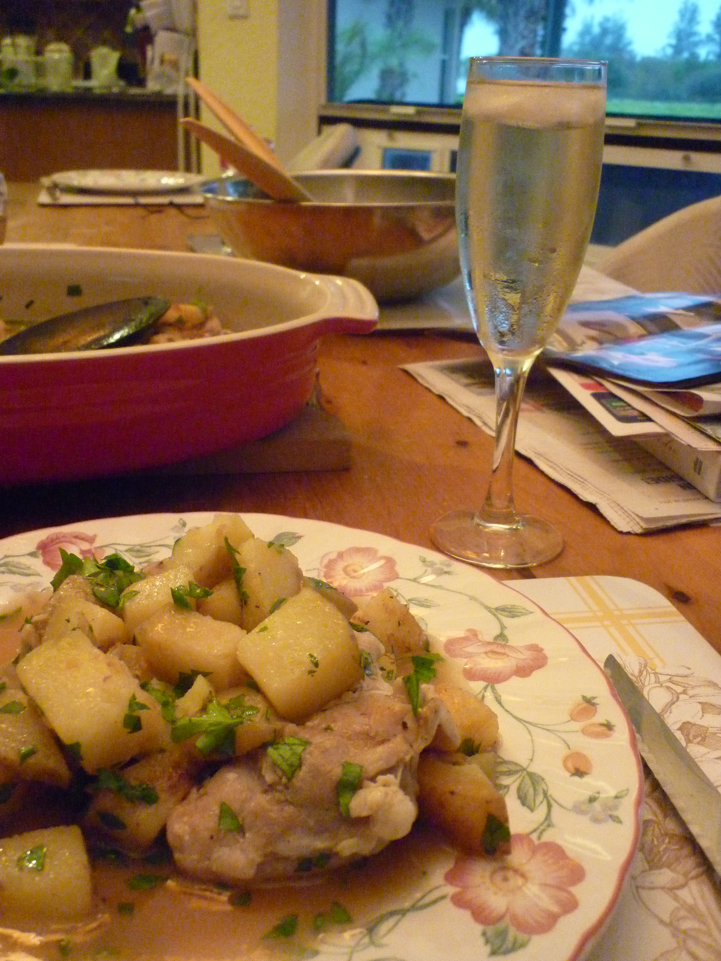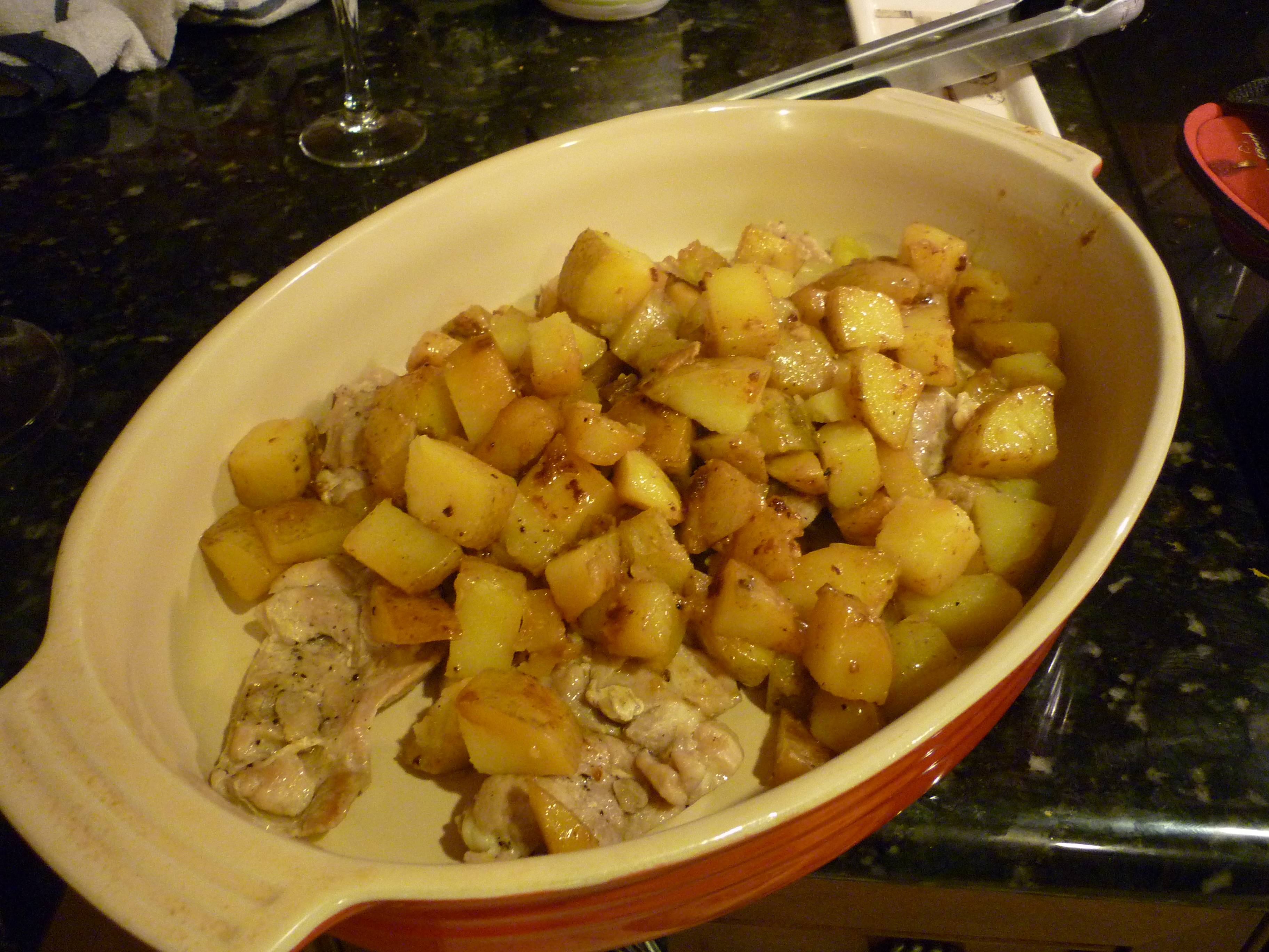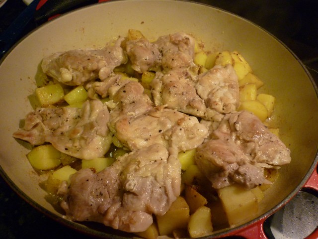 when the potatoes are browned, place the chicken on top, cover and cook over low heat about 15 minutes