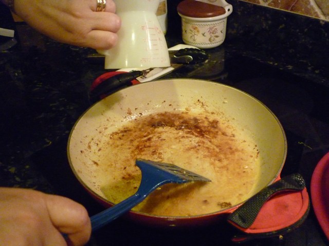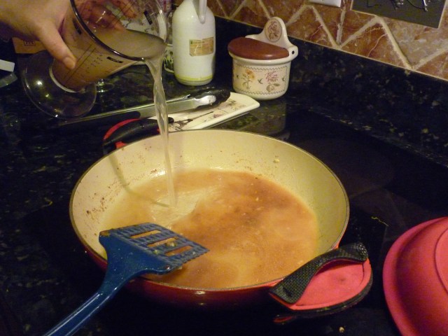 Let the wine and chicken broth simmer for a minute. Scrape up all the browned bits from the pan.