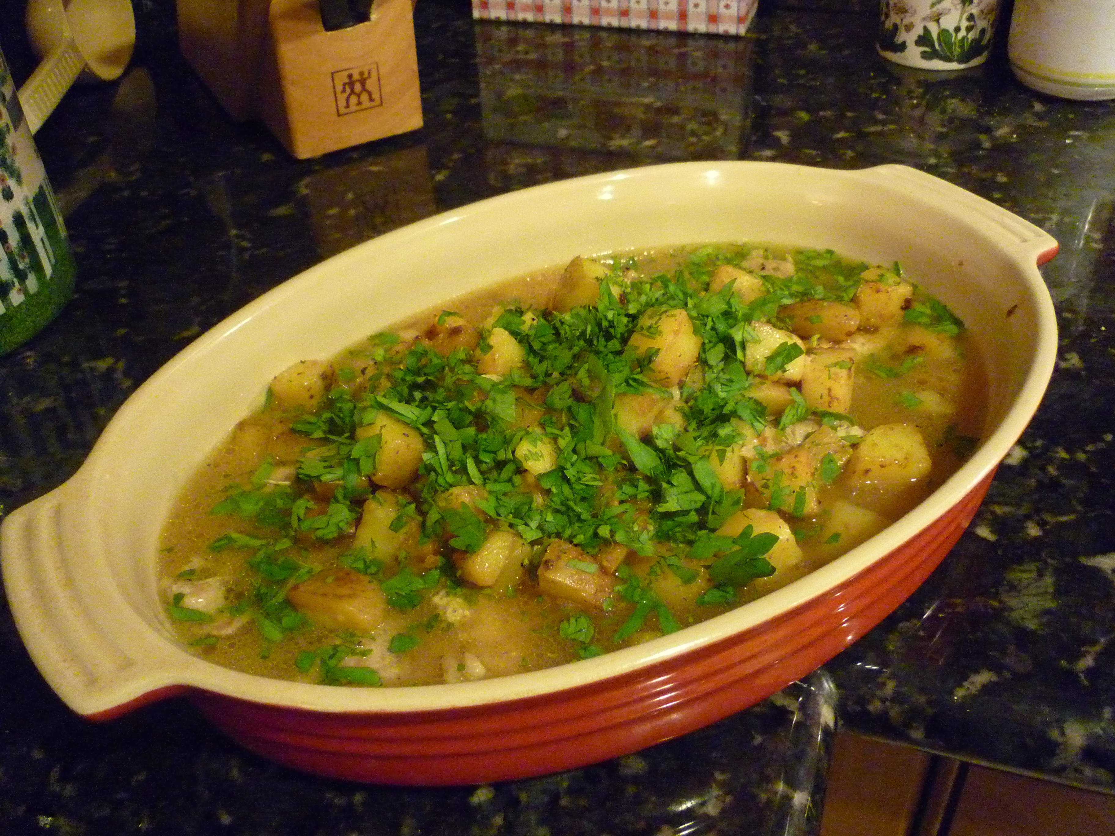 Remove the wine sauce from the heat and pour over the chicken and potatoes. Sprinkle the parsley on top and we're all set.