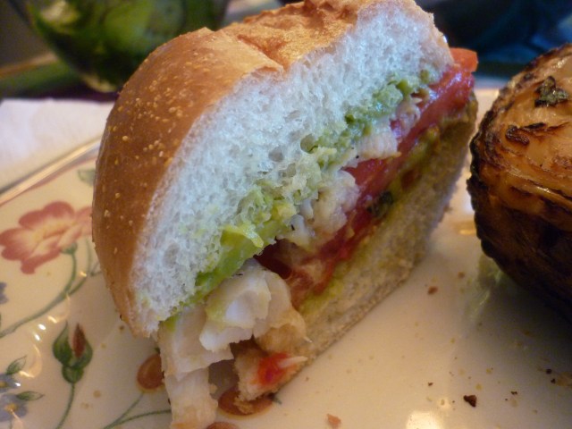 Grilled tilapia on a hard roll with Guacamole, tomatoes & red peppers. Side of grilled cabbage with butter, salt & pepper.