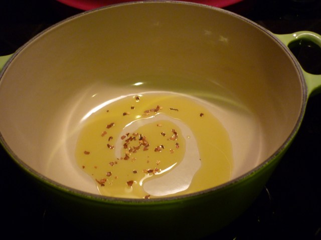 Let’s start with some olive oil, twice around the pot with some red pepper