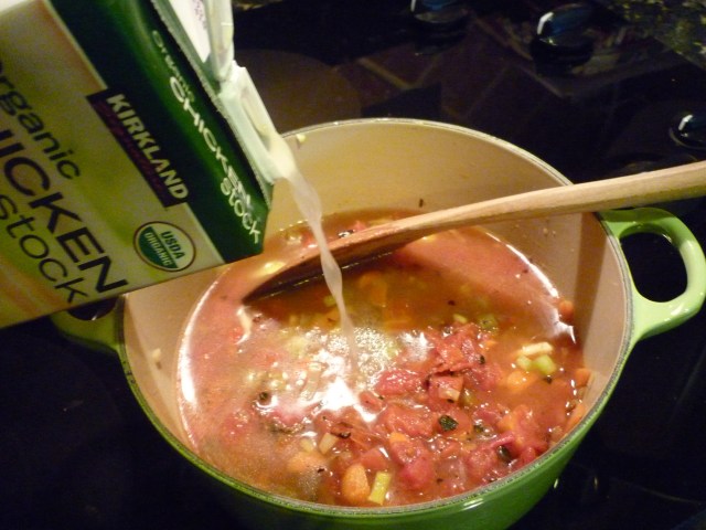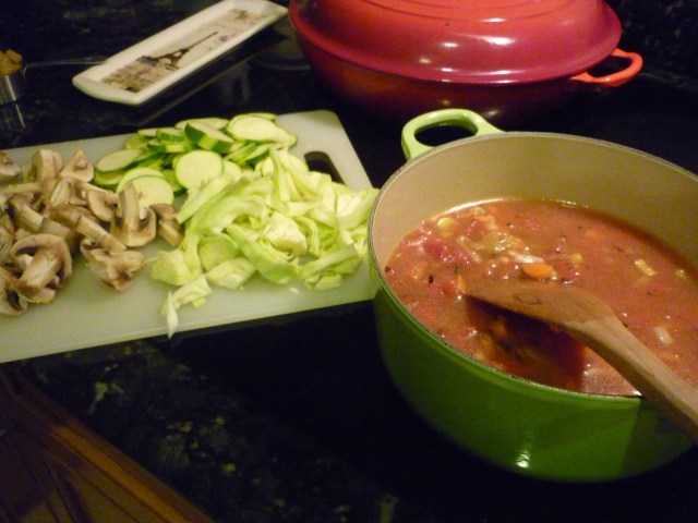 This is a nice soup, the one I always make when I’m ready to start Weight Watchers. It’s amazingly versatile, usually based on whatever leftover veggies I have in my fridge to use up on a Saturday before I visit the farmer’s market and buy fresh. If you follow Weight Watchers, a nice big bowl of this soup is only about 2 points. Today I have some zucchini, some cabbage, mushrooms, turnips and a couple of carrots to use up.