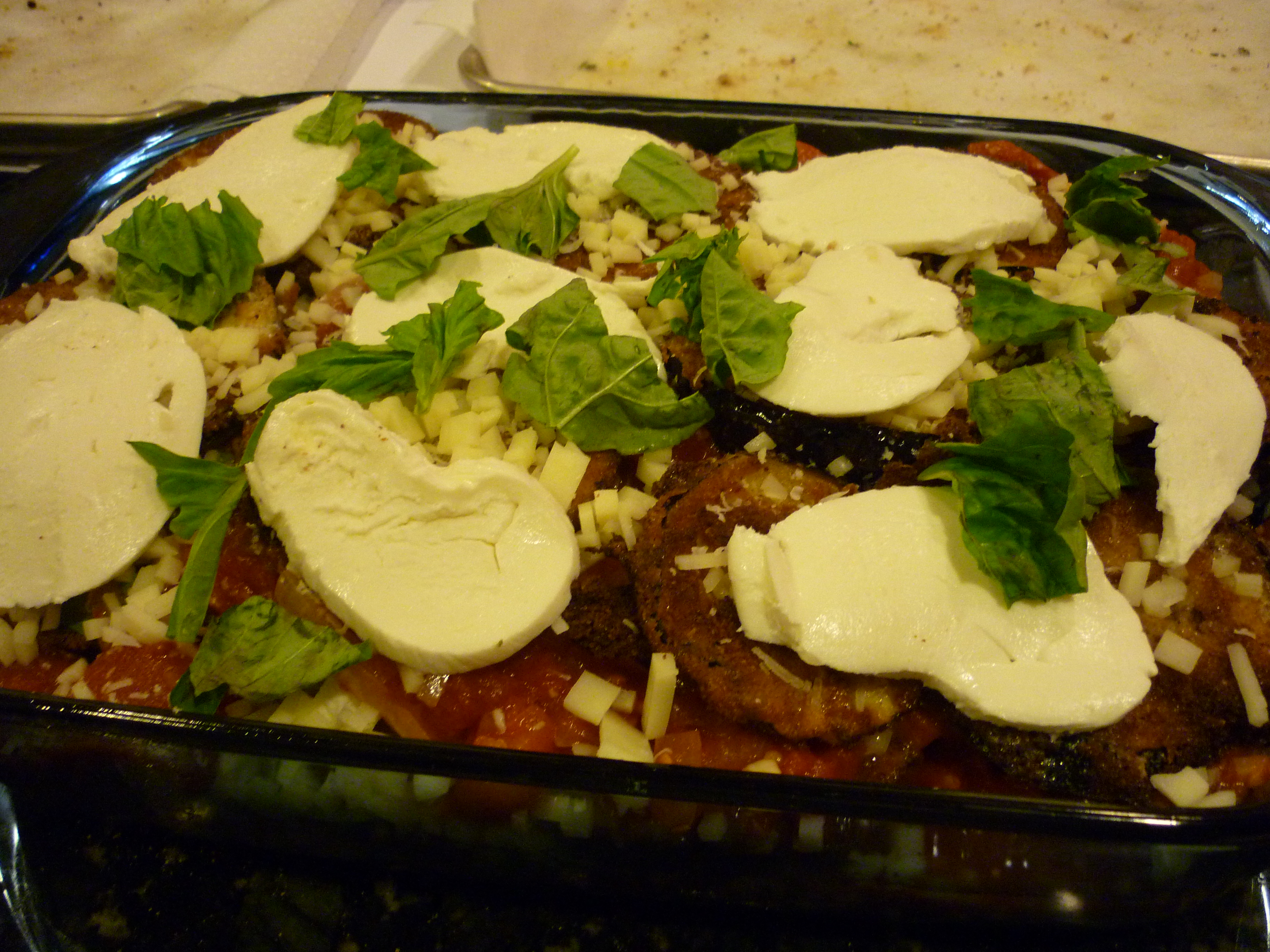 Now it’s time to assemble your masterpiece. Pre-heat your oven to 350, get out a lasagna pan. We’re going to make 3 layers. Spoon some sauce on the bottom of the pan, lay 1/3 of the fried lasagna, sprinkle some Parmesan, then the Prevalone, then lay slices of mozzarella. Tear the basil up an scatter 1/3 over the top. Continue twice more, ending with the mozzarella and scattered basil on top.