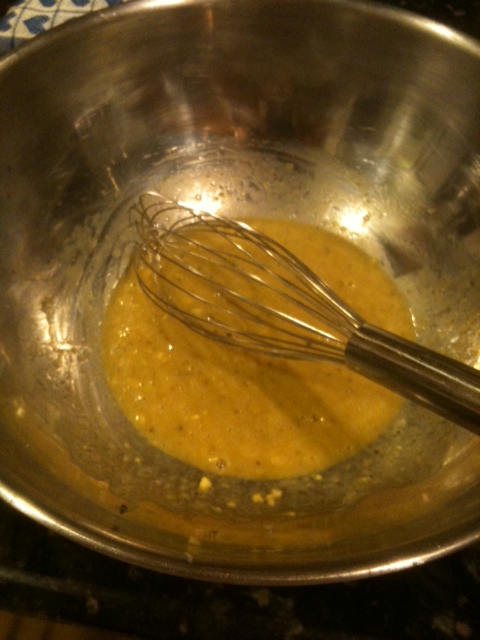 Crack the coddled egg into the bowl and whisk. Stream in the Olive oil and continue to whisk until emulsified