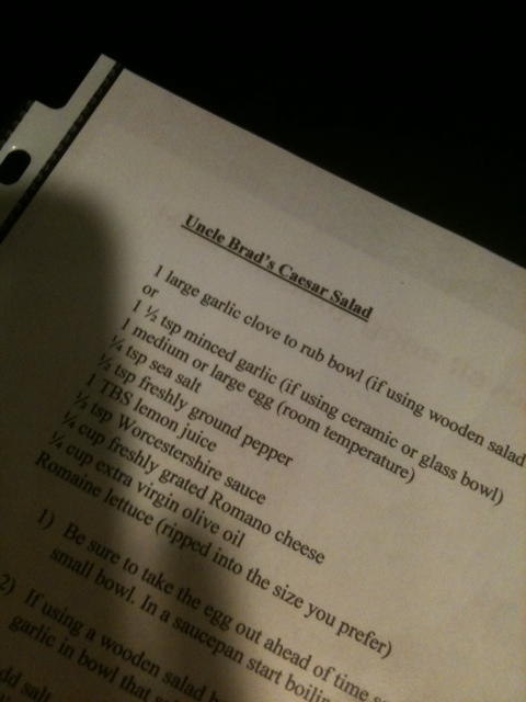 This is a recipe from one of my dearest friends, Brad. While visiting him in CT on our Girl’s Only Summer Road Trip 2 summers ago, we gathered at his apartment for an impromptu dinner party. Present were my daughter Lacey, my niece Noelle, “Uncle” Brad and his friend Peter. Noelle, who usually hates anything green, went wild over Uncle Brad’s Caesar Salad and shocked us all by clearing her plate. Whenever I make this salad, it reminds me of my good friend and how much I miss him.