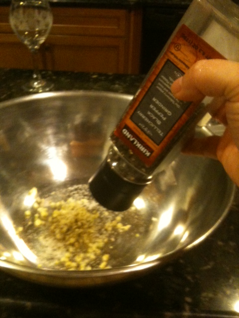 Add minced garlic to salad bowl. Add salt, pepper, lemon juice and Worcestershire sauce.