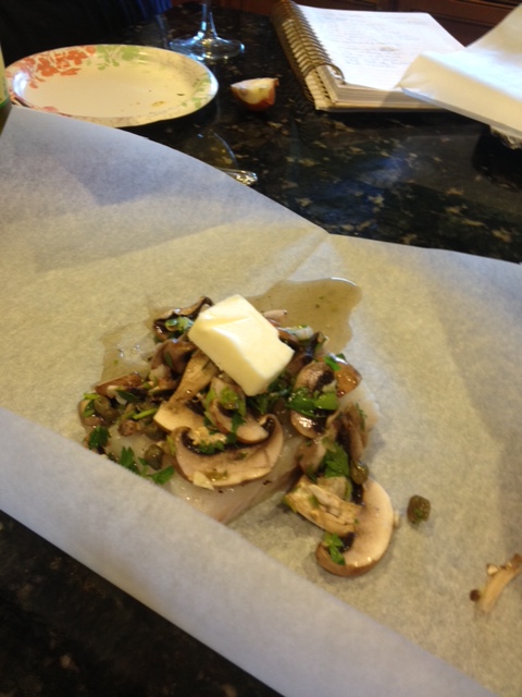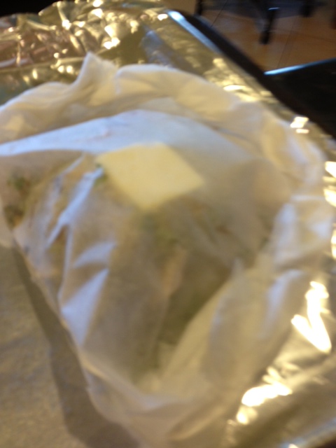 Cut the parchment paper into 2 10 x 10 inch squares. Fold in half and lay the edge of the fish filet along the fold, centered vertically. Pile half of the mixture on top of the filet and add the pat of butter on top.