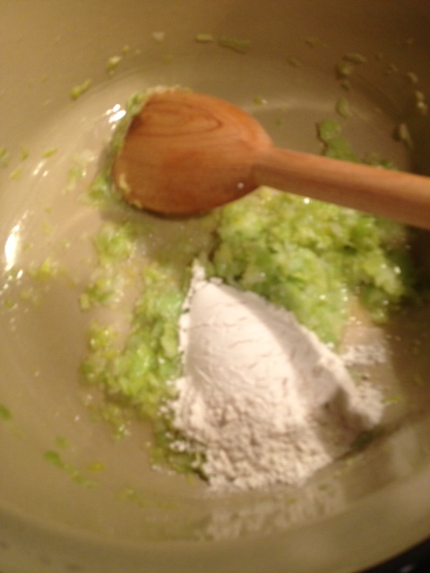 Cover and cook slowly 7 to 8 minutes or until leeks are translucent and tender. Add 1/4 cup of flour, blending it in. Stir slowly for 3 minutes, cooking the flour without letting it color. Meanwhile, heat up a cup of the chicken stock in the microwave until hot.
