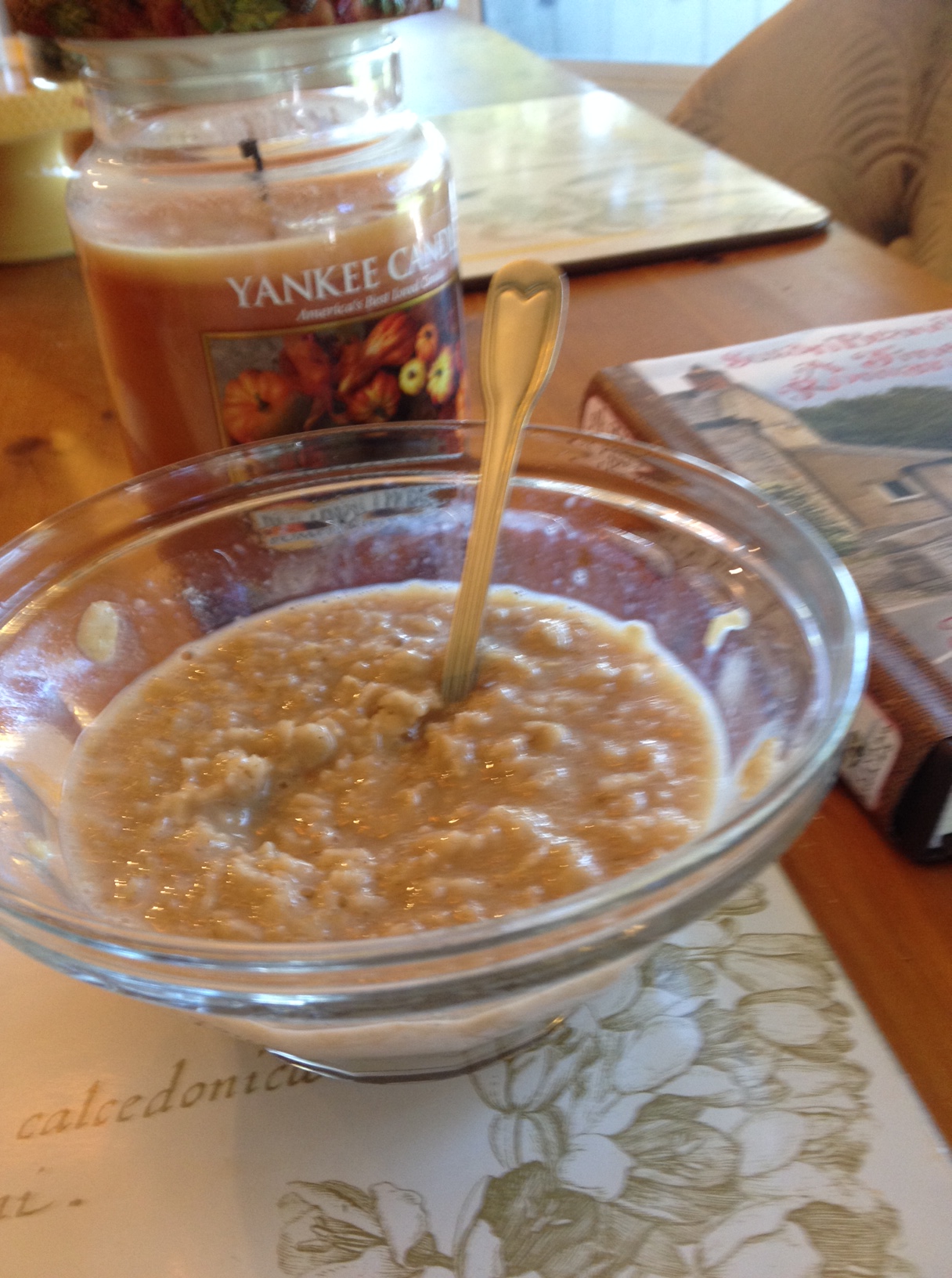 Take a cup of some good, old-fashioned organic oats, a cup of water, pinch of salt, 1 teaspoon of pumpkin pie spice (click link for my homemade version) and 2 teaspoons of brown sugar. Boil the water and pinch of salt, add the oatmeal and pumpkin pie spice and cook over medium heat for 5 minutes. In the last minute, add the brown sugar. Splash in a little milk, stir and enjoy! Tastes just like Fall.